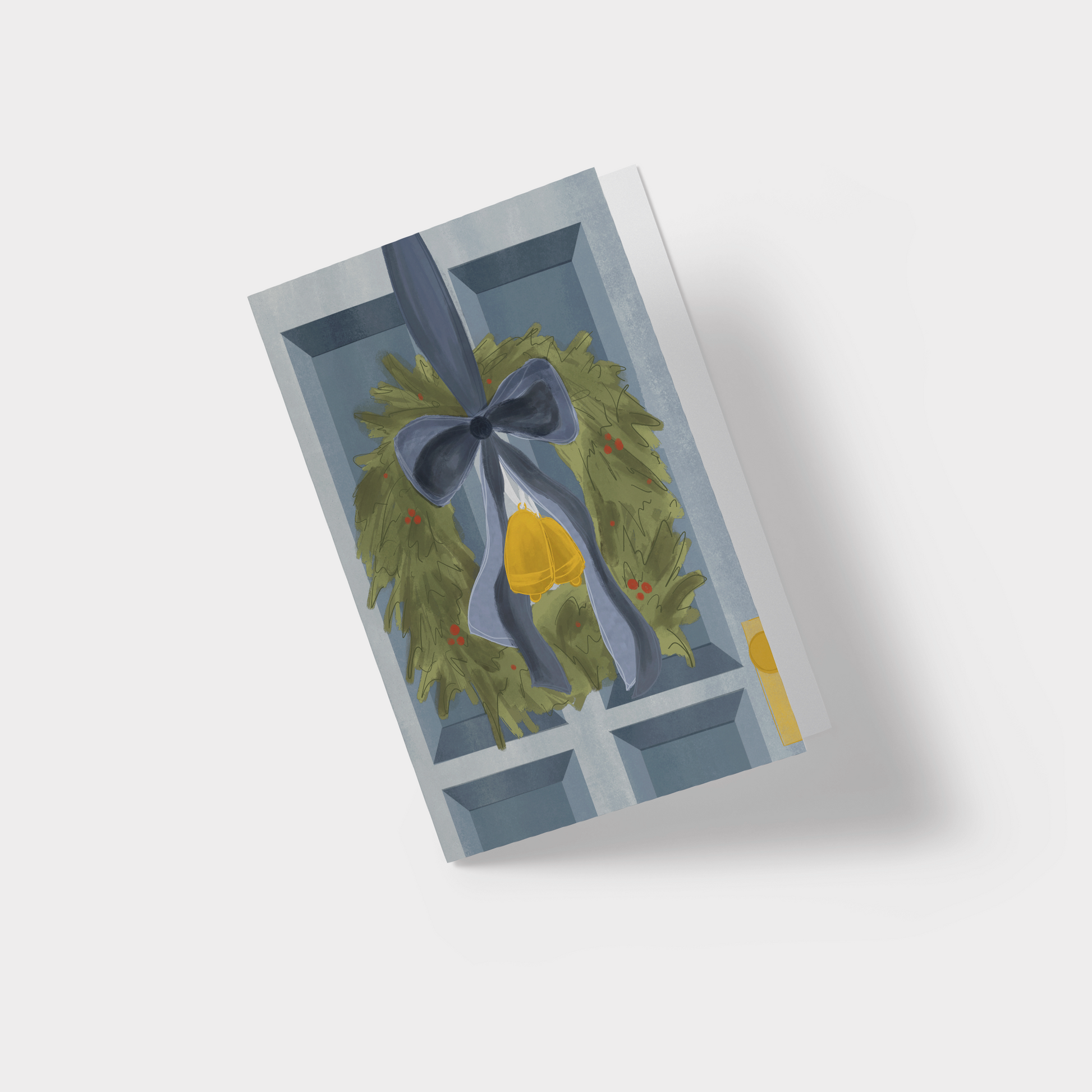 Warm, welcoming, and full of quiet Christmas charm — this hand-illustrated card captures the timeless beauty of the season. A golden bell hangs gently from a lush wreath tied with a deep navy ribbon, resting on a frosty blue door that feels like home. It’s a cozy nod to holiday traditions and heartfelt hellos from the front porch. Perfect for sending Christmas greetings, hostess notes, or winter well wishes.